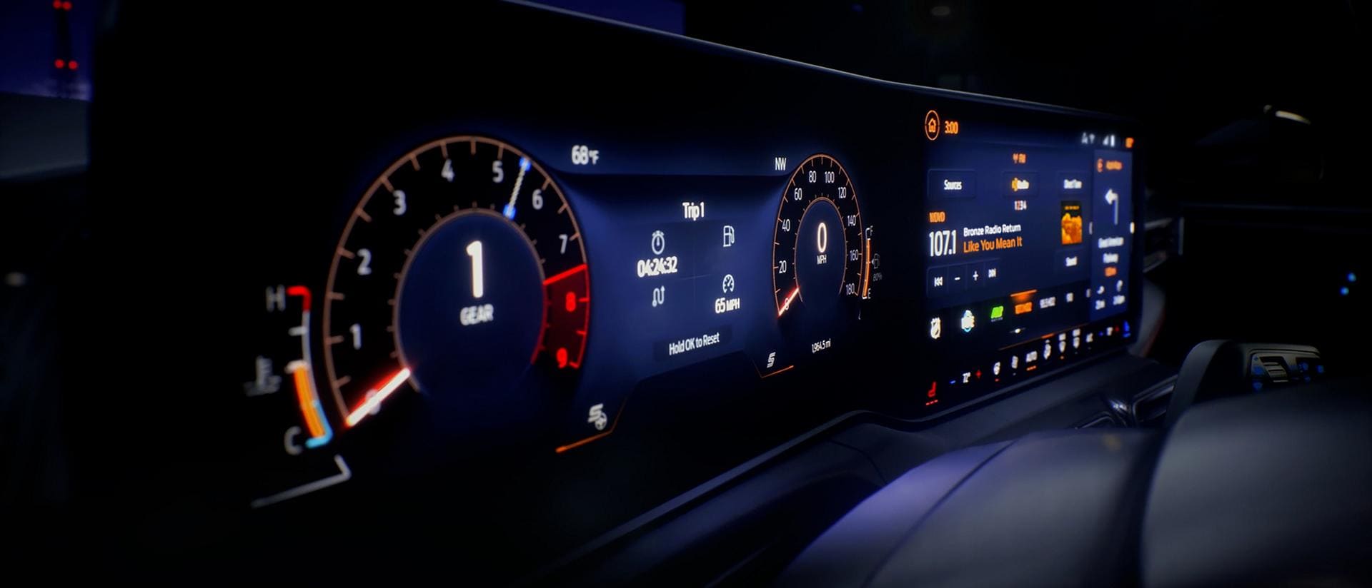 You've made it to the big screen. The available 12.4" cluster display with IOD (Information On Demand) message center and 13.2" center display with swipe capability are now under one expansive piece of glass. With the custom information you need at a glance, your eyes will spend less time straining and more time on the road.