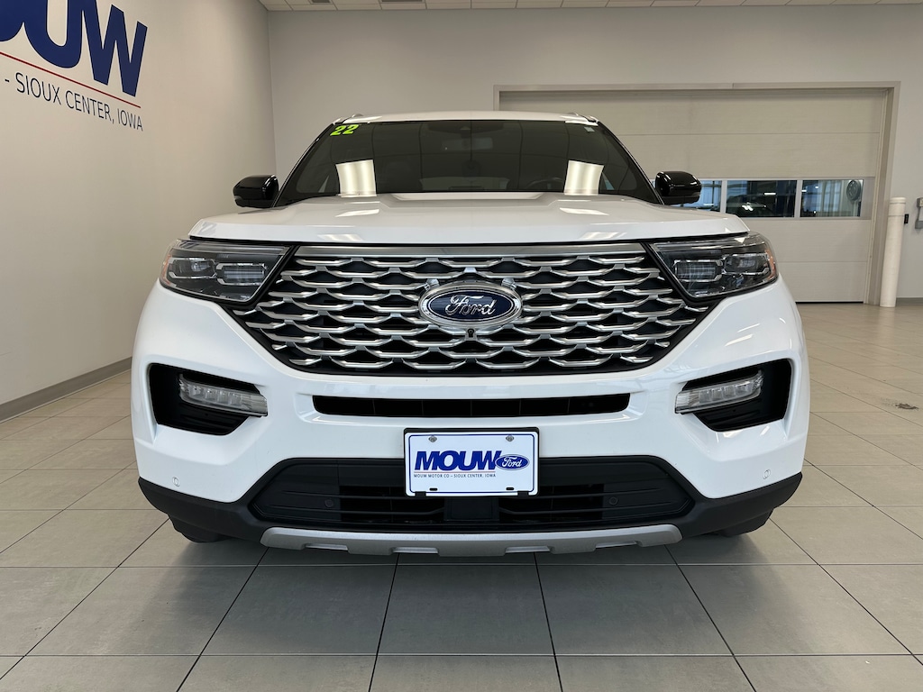 Mouw Motor is proud to present this 2022 Ford Explorer Platinum. Star White Metallic Tri-Coat 4WD 10-Speed Automatic 3.0L EcoBoost V6 4WD, 10.1" LCD Capacitive Portrait Touchscreen, 1st Row Heated Seats, 2 Additional Speakers, 3.31 Non-Limited-Slip Rear Axle Ratio, 3rd row seats: bench, Active Cruise Control, Automatic temperature control, Class IV Trailer Tow Package, Equipment Group 601A, Exterior Parking Camera Rear, FordPass Connect, Front dual zone A/C, Garage door transmitter, Hands-Free Liftgate Delete, Heated front seats, Heated rear seats, Heated steering wheel, Leather Htd/Ventilated Sport Captain's Chairs, Memory seat, Power driver seat, Power Liftgate, Radio: B&O Sound System by Bang & Olufsen, Rain sensing wipers, SYNC 3 Communications & Entertainment System, SYNC 3/Apple CarPlay/Android Auto, Technology Package, Twin Panel Moonroof, Ventilated front seats, Voice-Activated Touchscreen Navigation System, Wheels: 21" Bright Machined-Face Aluminum.
