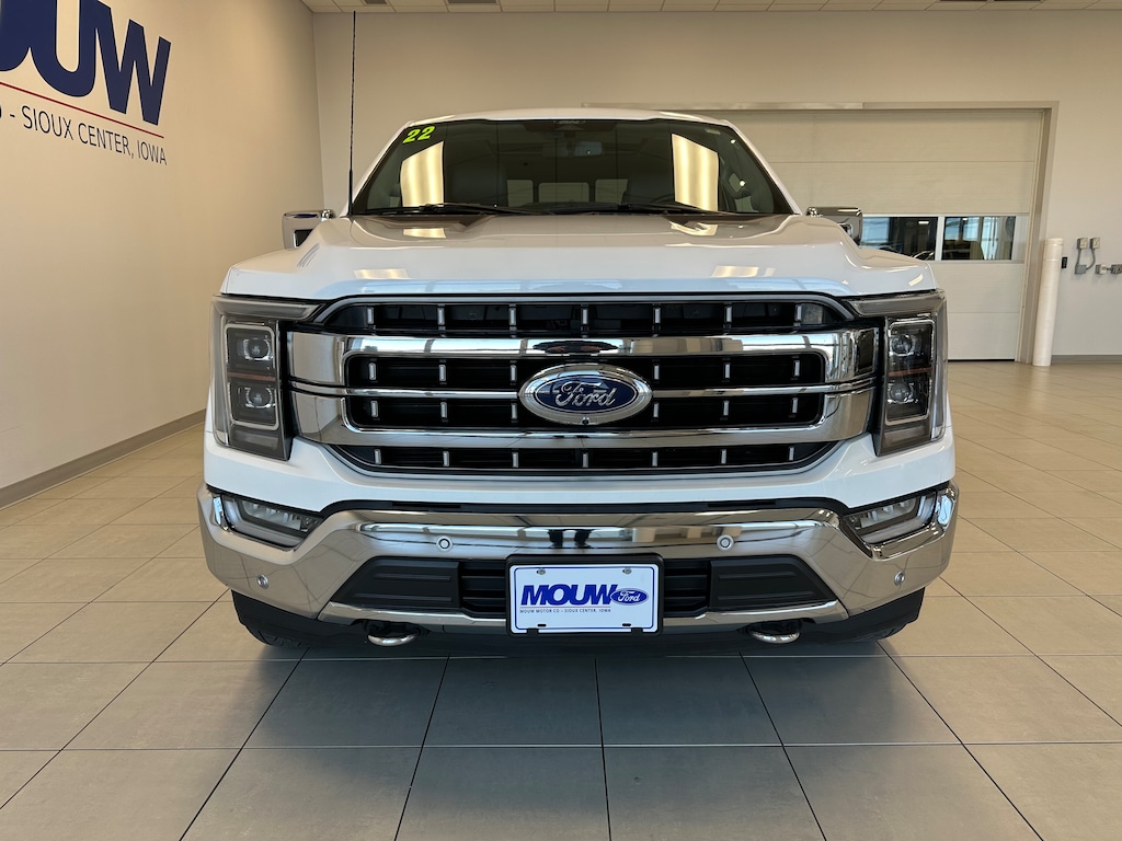 Mouw Motor is proud to present this 2022 Ford F-150 Lariat. Star White Metallic Tri-Coat 4WD 10-Speed Automatic 5.0L V8 One-owner, Local trade-in!, 4WD, 2nd Row Heated Seats, 360 Degree Camera, 6" Bright Polished Running Board, Auto High-beam Headlights, Auto-dimming Rear-View mirror, Automatic temperature control, Chrome 2-Bar Grille w/4 Minor Bars, Chrome Door & Tailgate Handles w/Body-Color Bezel, Chrome Single-Tip Exhaust, Chrome Skull Caps on Exterior Mirrors, Connected Built-In Navigation, Equipment Group 502A High, Evasive Steering Assist, Extended Range 36 Gallon Fuel Tank, Exterior Parking Camera Rear, Ford Co-Pilot360 Assist 2.0 (DISC), Front dual zone A/C, Heated door mirrors, Heated Steering Wheel, Integrated Trailer Brake Controller, Intelligent Adaptive Cruise Control w/Stop & Go, Intersection Assist, Lariat Chrome Appearance Package, Leather-Trimmed Bucket Seats, LED Projector w/Dynamic Bending Headlamps, Memory seat, Onboard 400W Outlet, Power Glass Sideview Mirr w/Chrome Skull Caps, Power Tilt/Telescoping Steering Column w/Memory, Pro Trailer Backup Assist, Radio: B&O Sound System by Bang & Olufsen, Rain-Sensing Wipers, Speed Sign Recognition, SYNC 4 w/Enhanced Voice Recognition, Tow Technology Package, Twin Panel Moonroof, Universal Garage Door Opener, Wheels: 20" Chrome-Like PVD, Wireless Charging Pad.